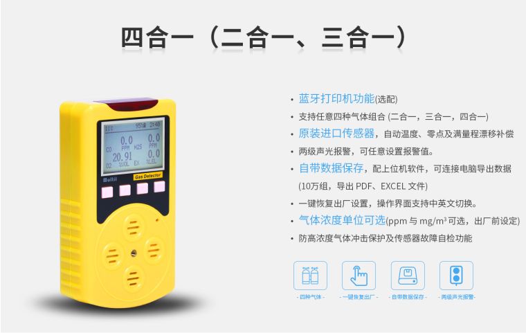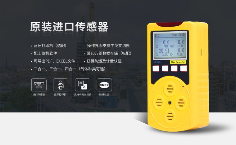 ◆ 原装进口传感器,两级声光报警,中英文切换。