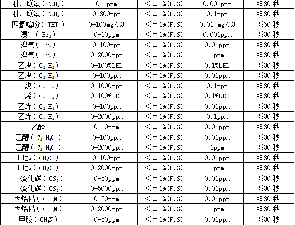 部分可检测气体列表: