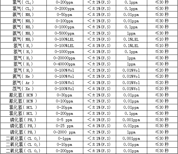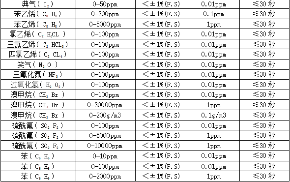 部分可检测气体列表:
