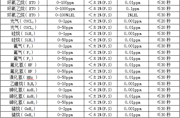部分可检测气体列表: