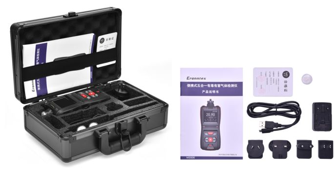 MS500便携式检测报警仪用于便携式快速检测有毒有害气体浓度、温湿度测量并超标报警的场合。采用2.5寸高清彩屏实时显示浓度,选用进口品牌(霍尼韦尔、日本根本、英国CITY、英国阿尔法、英国Dynament、瑞士Membrapor等)气体传感器,主要检测原理有:电化学、红外、催化燃烧、热导、PID光离子。先进的电路设计、成熟的内核算法处理,取得了多项软件著作专利和外观专利。MS500可以检测管道中或受限空间、大气环境中的气体浓度,可以检测气体泄漏或各种背景气体为氮气或氧气的高浓度单一气体纯度,检测气体种类超过500种。