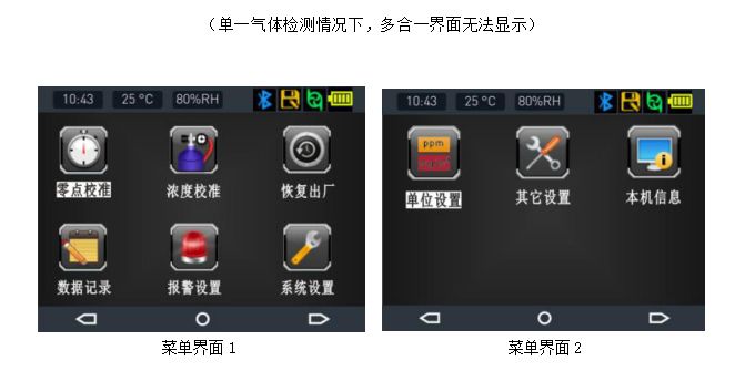●2.31寸高清彩屏显示实时浓度、报警、时间、温度、湿度、存储、通信、电量、充电状态等信息,菜单界面采用高清仿真图标显示各个菜单的功能名称