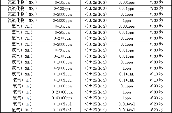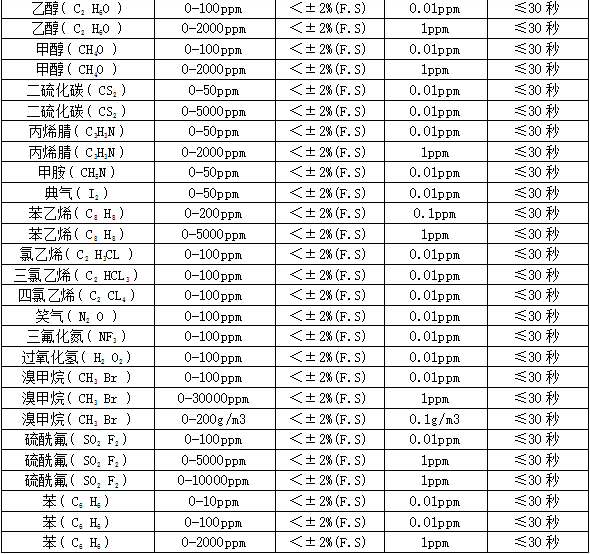 部分可检测气体列表: