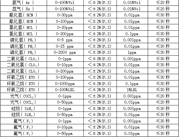 分 辨 率:0.01ppm或0.001ppm(0~10 ppm);0.01ppm(0~100 ppm),0.1ppm(0~1000 ppm),1ppm(0~1000 ppm以上),0.01毫克/升(0~200%毫克/升),0.1%LEL,0.01%,0.001%Vol