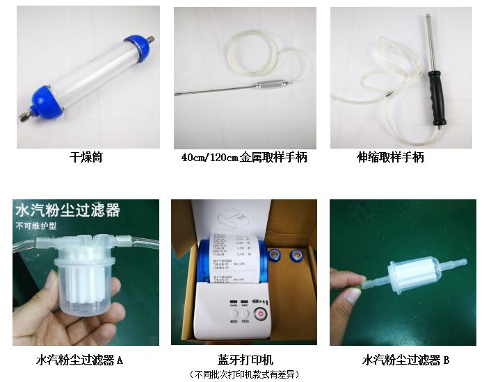 可伸缩采样手柄(1-10米软管,标准长度1米)、外置远距离采样泵、高温采样降温过滤手柄、高温高湿预处理系统、光盘(上位机通讯软件)、外置微型无线蓝牙打印机、内置微型打印机、SD卡存储、U盘存储、无线数据通讯