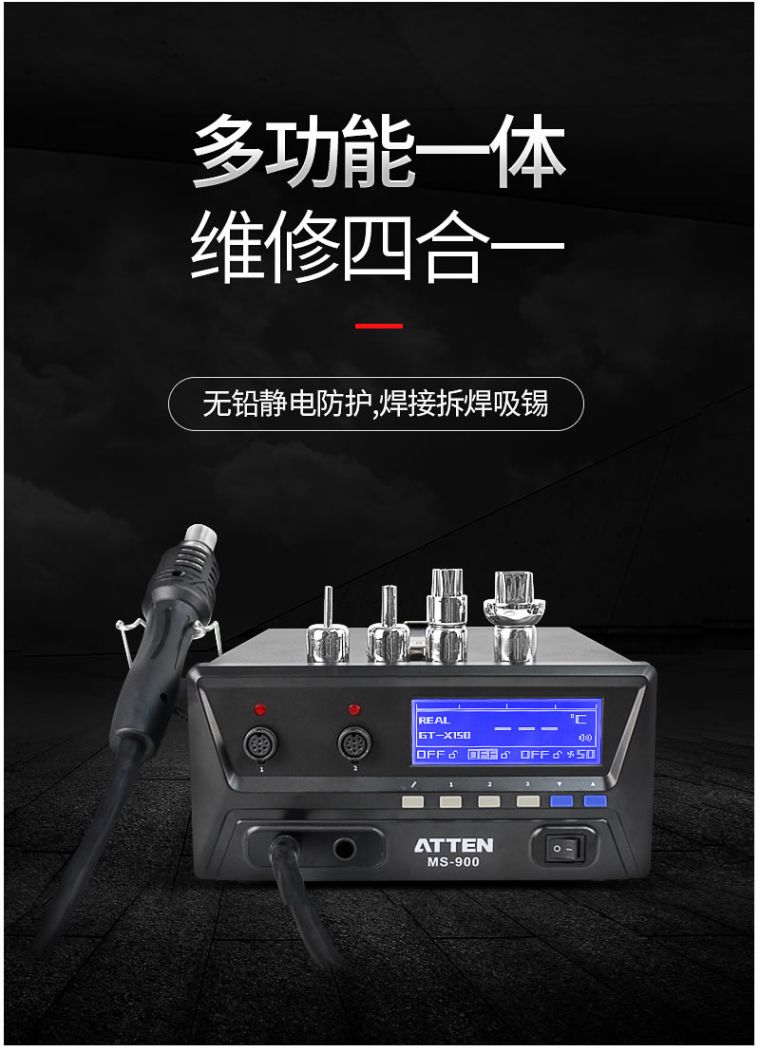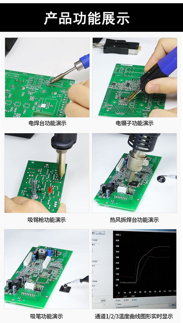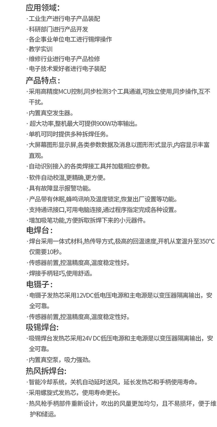套餐包含主机一台,吸锡枪一只,拆焊台风枪一只,焊台手柄一只,电镊子一只,电源线一根,风枪支架一个,烙铁座两个,说明书一本,吸锡枪内胆一个,过滤棉9块,防烫垫一块,弹簧通针一根,防火毡5个,吸锡咀3个,喷嘴4个,螺丝2颗,吸枪塞9个,吸枪垫9个,吸锡枪O形圈3个,吸咀3个,吸盘11个,弹簧3个