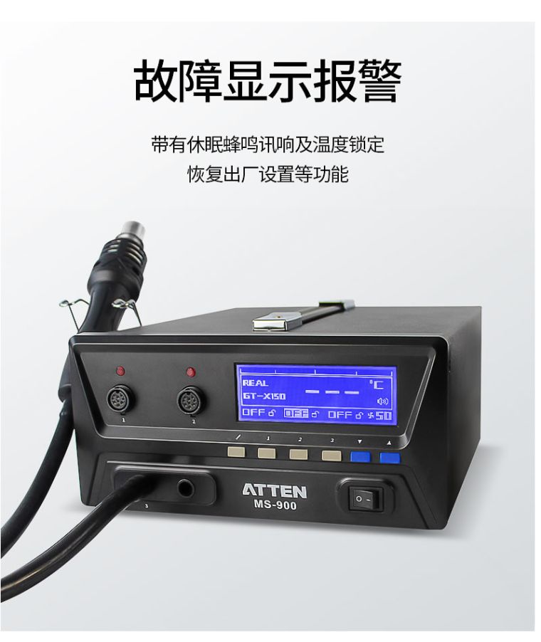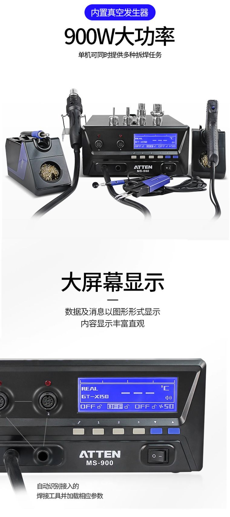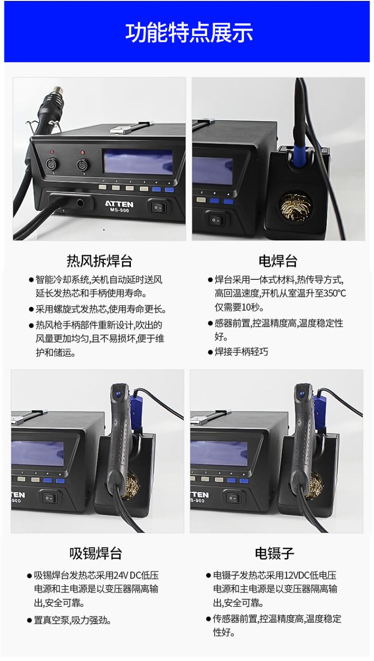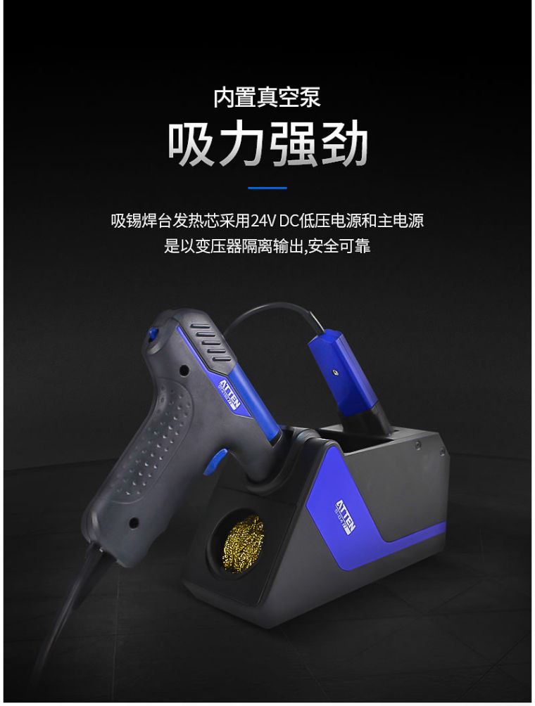 套餐包含主机一台,吸锡枪一只,拆焊台风枪一只,焊台手柄一只,电镊子一只,电源线一根,风枪支架一个,烙铁座两个,说明书一本,吸锡枪内胆一个,过滤棉9块,防烫垫一块,弹簧通针一根,防火毡5个,吸锡咀3个,喷嘴4个,螺丝2颗,吸枪塞9个,吸枪垫9个,吸锡枪O形圈3个,吸咀3个,吸盘11个,弹簧3个
