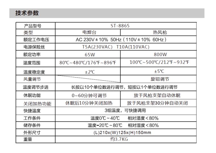 套餐包含ST-8865主机: 1 台,风枪手柄:1支,风枪支架:1个,风枪喷咀:4个,焊台手柄:1支,烙铁座:1个,说明书: 1 本, 电源线: 1 条,