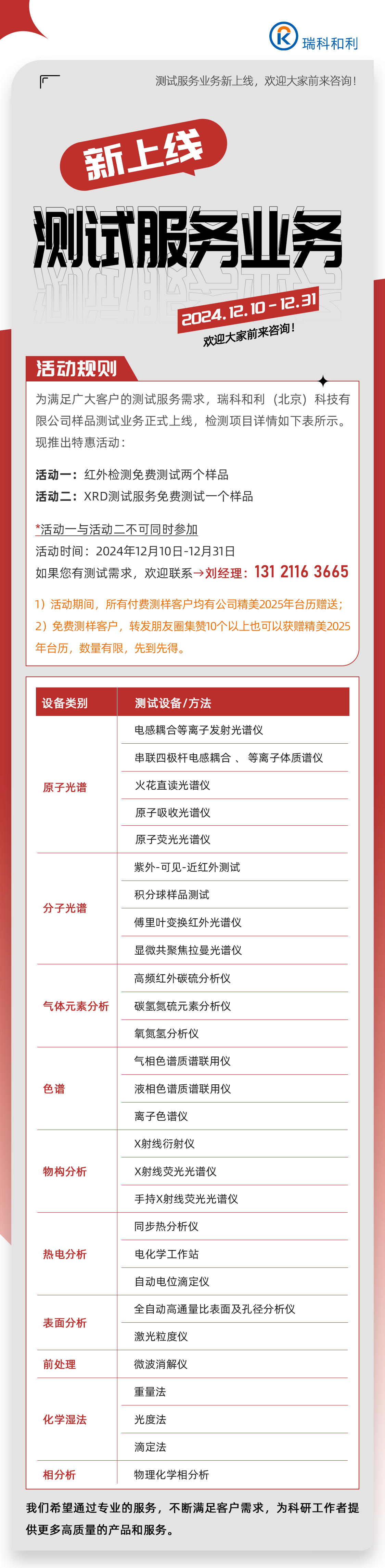 为满足广大客户的测试服务需求,瑞科和利(北京)科技有限公司样品测试业务正式上线,检测项目详情如下表所示。现推出特惠活动: