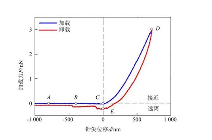 天津理工大学天津市先进机电系统设计与智能控制重点实验室王鑫老师团队[1]通过探究角膜基质细胞-底物之间的相互作用对细胞形态及力学特性的影响。将角膜基质细胞分别培养在三种不同硬度的基底上,三种基底分别为空白普通培养皿(硬基底), 2D胶原上(鼠尾Ⅰ型胶 原蛋白包被的培养皿), 3D胶原上(三维鼠尾Ⅰ型胶原蛋白的培养皿), 通过布鲁克生物型原子力显微镜(Bioscope)表征角膜基质细胞的形貌,并且利用AFM力曲线阵列模式获得角膜基质细胞上选定区域的力-位移曲线, 通过模型拟合力-位移曲线获得相应的弹性模量, 以此探究角膜基质细胞在不同基底上的力学特性。将角膜基质细胞置于细胞培养液中且保证液体温度在37℃左右。待温度稳定后,再进行样本扫描,使用的AFM工作模式为Peak Force QNM in Fluid,得到角膜基质细胞的形貌图,再利用AFM的force volume模式对已测得的细胞形貌区域内做力-位移曲线。将细胞压痕保持在弹性范围内。角膜基质细胞上所测得的典型力-位移曲线如图1。
