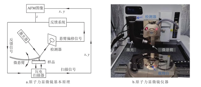 AFM是一种用于分析表面形貌的仪器。其基本工作原理如图1所示,将一个对弱力极其敏感的微悬臂固定在一端,另一端装载一个微型探针。探针的尖端原子与样品表面的原子之间存在相互作用力。 当探针接近样品表面时,受力使探针和微悬臂发生波动,通过对这些变化进行检测与转换,从而呈现出样品表面测量点的高度值。 基于此原理以一定间隔扫描区域内所有测点,从而获得样品表面形貌图。