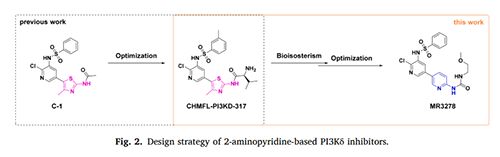研究表明,PI3Kδ抑制剂化合物CHMFL-PI3KD-317显示出了良好的体内抗B细胞相关肿瘤的功效,例如急性髓细胞性白血病(AML)。本文描述了一种生物电子等排取代法,来开发新颖的2-氨基吡啶类PI3Kδ抑制剂。对类似结构进行构效关系研究和生物学评价,确定了化合物MR3278是一种有效的PI3Kδ抑制剂,对体外血液细胞具有一定的抗增殖作用。