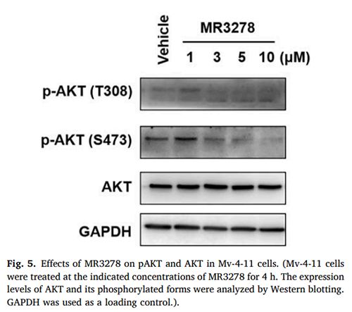 在证实了MR3278对PI3Kδ激酶活性、抗增殖、细胞周期和凋亡的影响后,又通过蛋白质印迹法(WB)检测其对Mv-4-11细胞中PI3K通路相关蛋白表达的影响。如图所示,随着MR3278浓度的增加,AKT的磷酸化水平逐渐降低,说明Mv-4-11细胞中PI3K通路的活性被阻断。总之,所有这些结果进一步证实了MR3278在抑制PI3Kδ激酶活性、阻断细胞周期和引起细胞凋亡方面的有效活性。