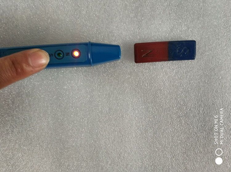 如下图所示,按住圆形按键开关,将磁极测定笔的测量端对被测磁体表面,直到发光二极管发亮。如果红色发光二极管亮,表明被测磁体表面为北极;如果蓝色发光二极管亮,表明被测磁体表面为南极。按住椭圆形按键开关,使磁极测笔沿磁体表面移动,可观察磁体从一个磁极变到另一个磁极的过程。