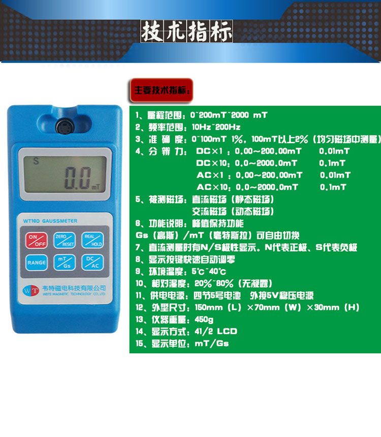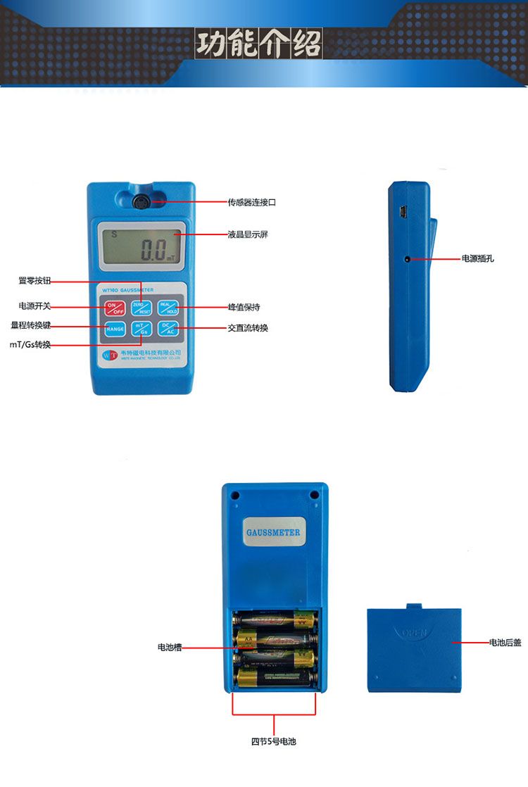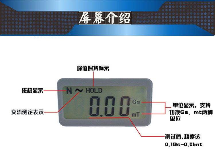 功能说明:峰值保持功能;Gs(高斯)/mT(毫特斯拉)可自由切换;直流测量时有N/S极性显示。N代表正极、S代表负极;显示按键快速自动调零