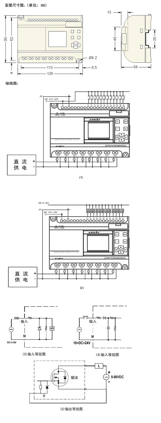 ▲此型号为直流供电,12点DC(带模拟量)输入,8点晶体管输出