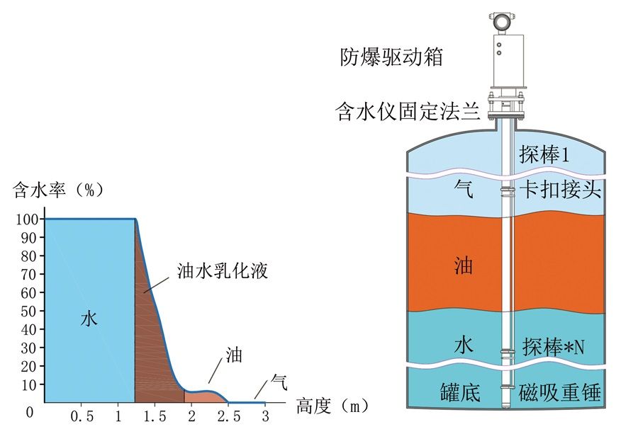 大罐分层含水分析仪是一款应用于联合站、集输站、炼油厂等场所储油罐、计量罐、三相分离器等大体积容器内的含水分析仪表,结构简单,安装维护方便。该含水分析仪采用先进的无辐射测量和数字分析技术,可以精确测量分析油罐内部各层含水率,实时检测油罐内液体液位、油水界面、乳化层厚度等的变化,精准绘制油罐内各个分层含水分布曲线,分析测量数据可通过实时通讯接口上传至监控平台。