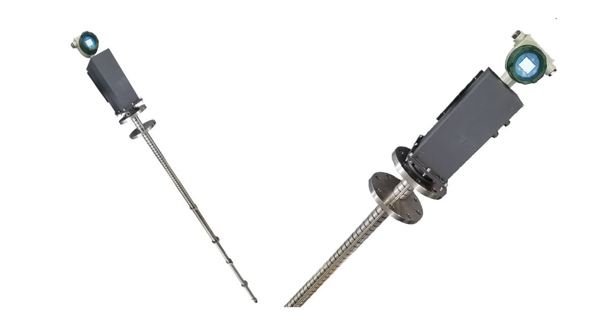测量传感器最上端为固定法兰,固定法兰下端通过螺柱与密封法兰相连,通过调整螺柱螺母锁紧高度调节探棒插入深度以匹配不同高度的储油罐。在传感器最底部设置有磁吸式重锤,可以将探棒吸附在罐体底部减少其随液体晃动产生的测量偏差。