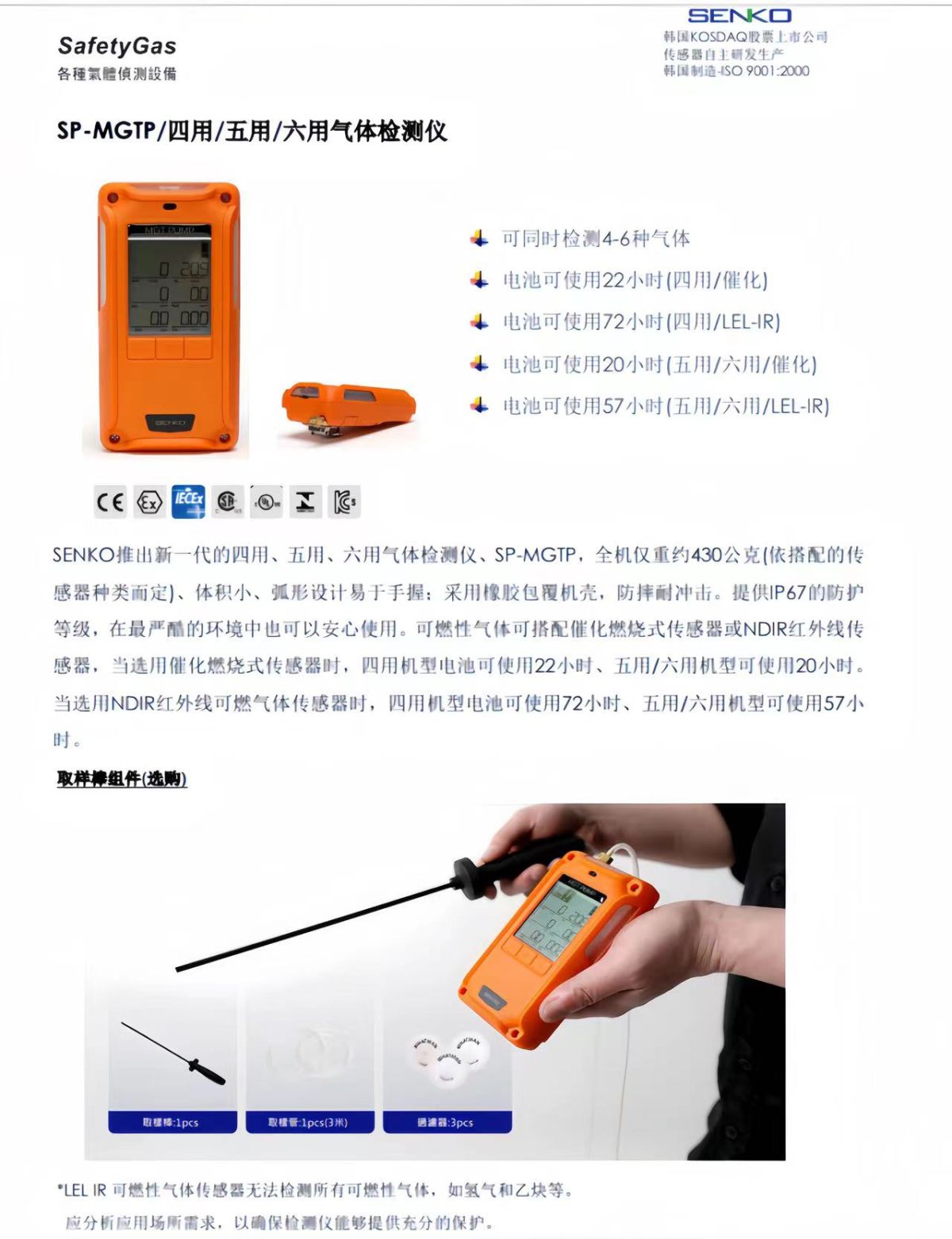 韩国SENKO推出新一代泵吸四合一气体检测仪、SP-MGTP全机仅重约430公克(依搭配的传 感器种类而定)、体积小、弧形