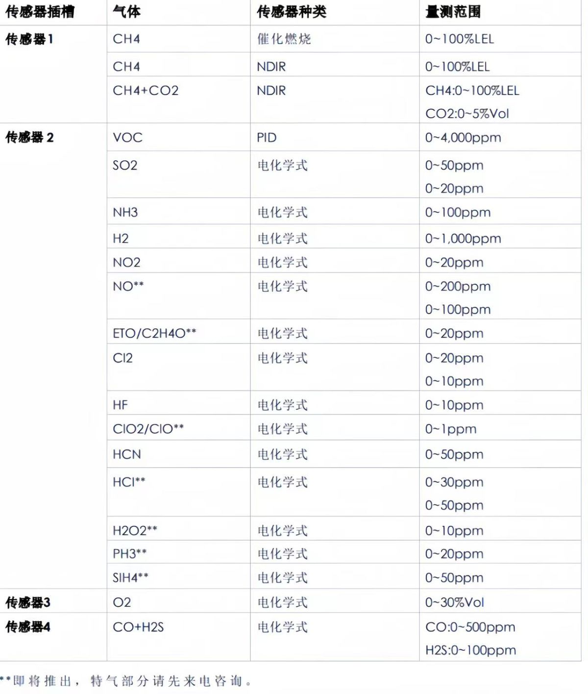 可同时检测4-6种气体 电池可使用22小时(四用/催化) 电池可使用72小时(四用/LEL-IR) 电池用20小时(五用/六用/催化) 电