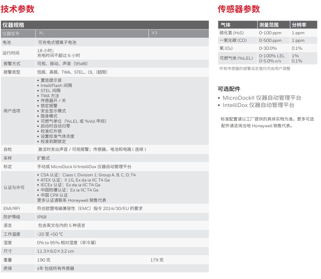坚固耐用、小巧轻便,最多可连续检测四种有害气体凭借多种优势,该款仪器当之无愧地成为全球各地受追捧的多气体检测仪,是 您在危险环境中值得信赖的伙伴 -- 无需繁重的装备,也能令您安全无虞。此外,它也是**一款 IP68 级多气体检测仪,拥有无可匹敌的防水能力 -- 在水深 1.2米处,防水长达 45 分钟。所以,您可以放心地将其应用于多种严苛环境。 以下两款检测仪,其电池均可连续运行高达 18 小时,一键式操作,经过霍尼韦尔严格 的质量检测:• 便携式气体 XL 检测仪 : 前期成本低• 便携式气体 X3 检测仪 : 配备全新的氧气传感器,总体预期使用寿命可长达 5 年。