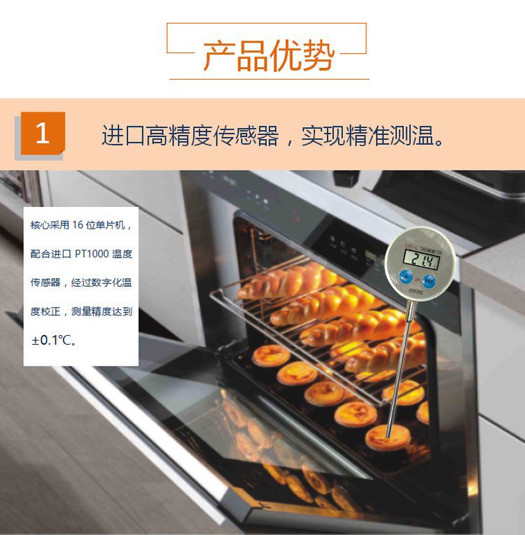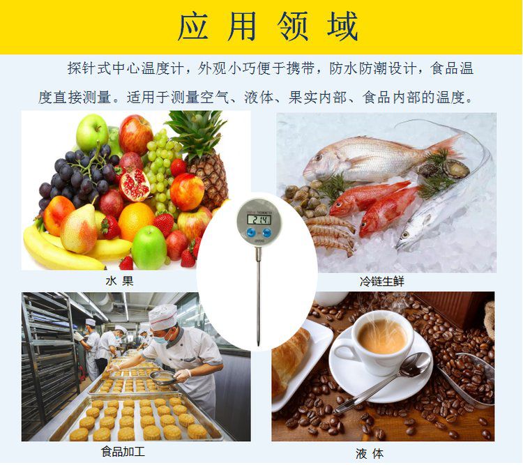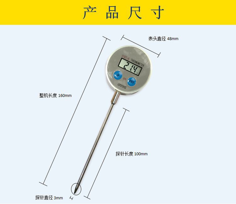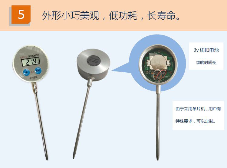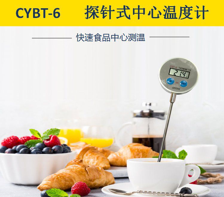 CYBT-6 便携温度表 用于测量空气、液体、果实内部、食品内部温度,是一款便携式 手持式 探针式温度计,核心采用16位单片机,配合进口PT1000温度传感器,达到了很高的测量精度。采用不锈钢探针式封装,经过特殊工艺处理,反应速度快,便于使用。整机采用防水设计,适合潮湿环境使用。由于采用单片机,用户有特殊要求,可以定制。