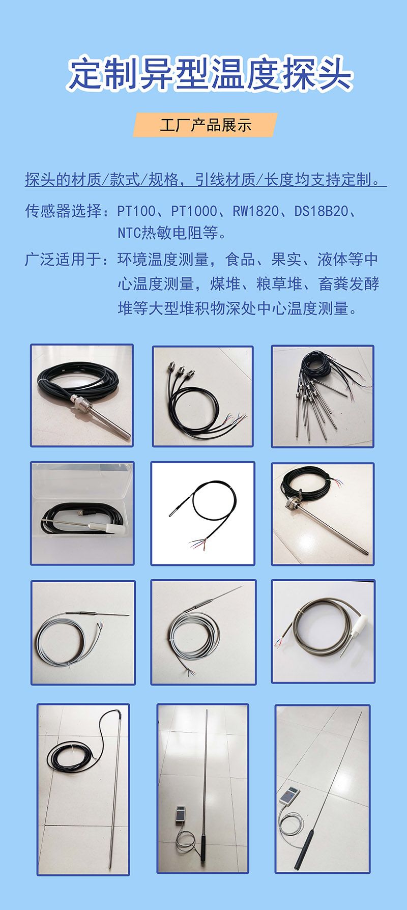 我公司可以针对客户不同需要,加工定制各类异型温度传感器、果心温度探头,RW1820 DS18B20 PT100 PT1000 NTC。