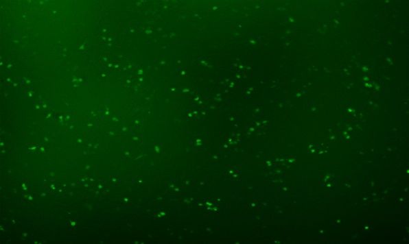 图A我们的试剂 转染0.8μgGFP质粒于Hela细胞,转染阳性率高达90%