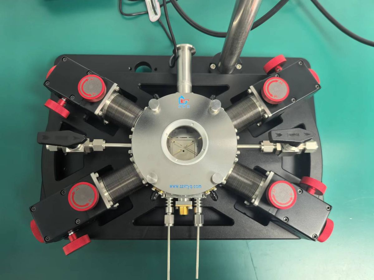 该探针台的承载台为26X26mm不锈钢台面,台面可升温到-190~350℃。真空腔体设计有进气口和抽真空接口。探针臂为X/Y/Z三轴移动,三个方向均可在真空环境下精密移位调节,其中X方向调节范围:0-13mm,y方向调节范围:0-13mm;z方向调节范围:0-13mm;用户可根据需要自行调节。使用时将需检测的器件固定在加热台上,再微调探针支架X/Y/Z 方向行程,通过显微镜观察,使探针对准检测点后,即可进行检测