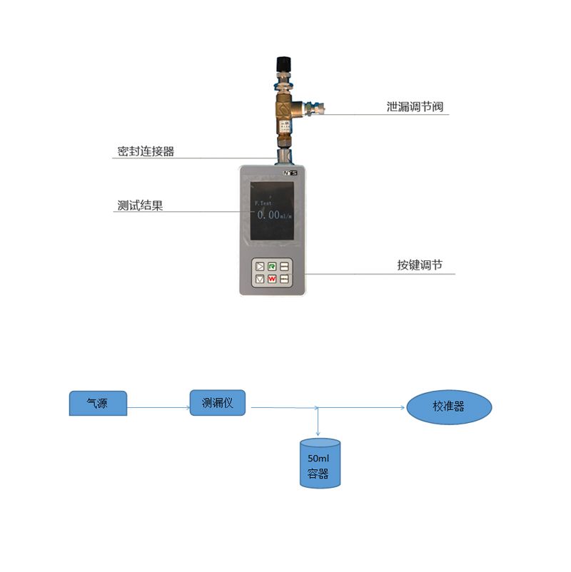 1、将仪器与校准器及已知容积容器连接。调整仪器泄漏单位为ml/min。调整容积,与校准器上的调节漏孔大小。