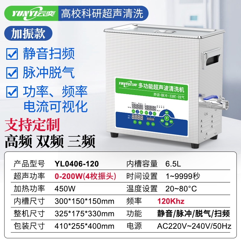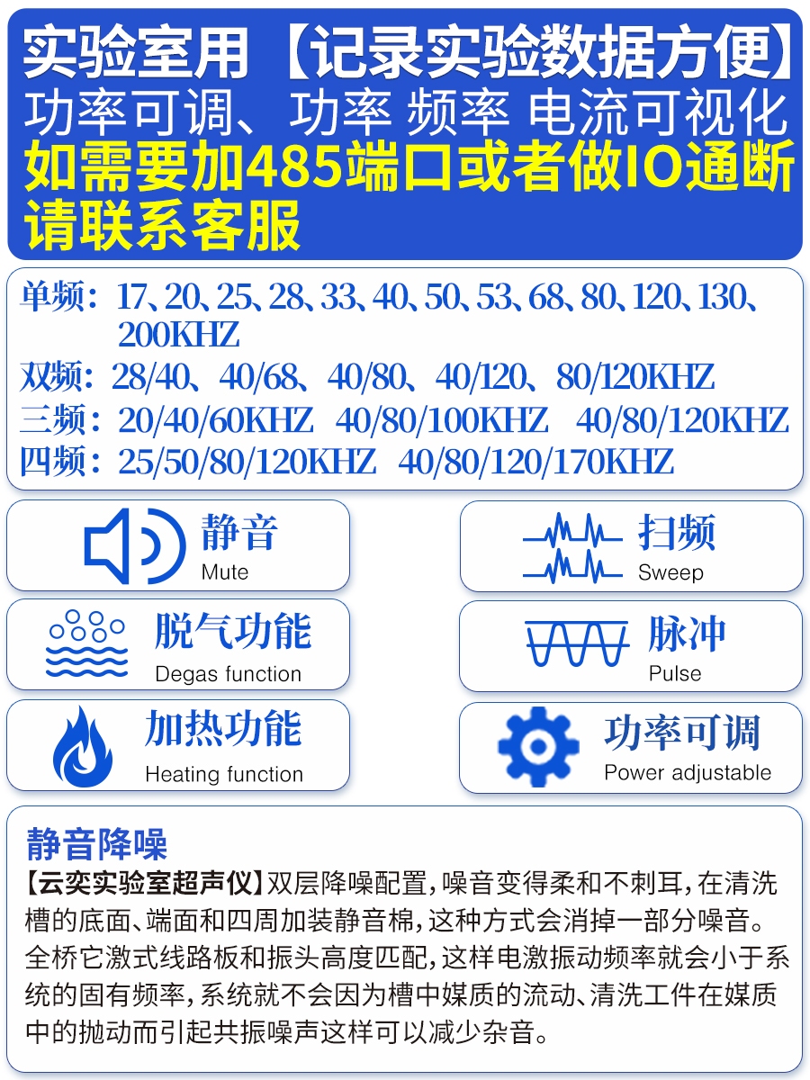 功能:静音、扫频、脉冲、脱气、加热、功率 频率 电流可视化、功率可调
