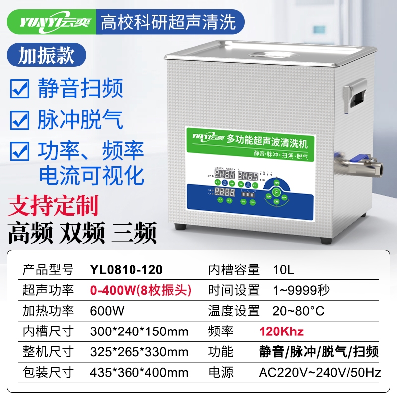实验室选品超声波清洗机时,务必要和商家沟通好是用于什么样的具体实验,选对频率直接关系到实验的最终结果,95%以上的实验室一般选择10L的清洗机,云奕YL0810-40是最常用的实验室超声波清洗机,多数用于实验器皿的清洗和一些普通的小实验。而云奕双频实验室超声波清洗机YL0810-40120也是众多实验室的**,低频+高频(40khz+120khz)可以解决多数的清洗和实验问题。