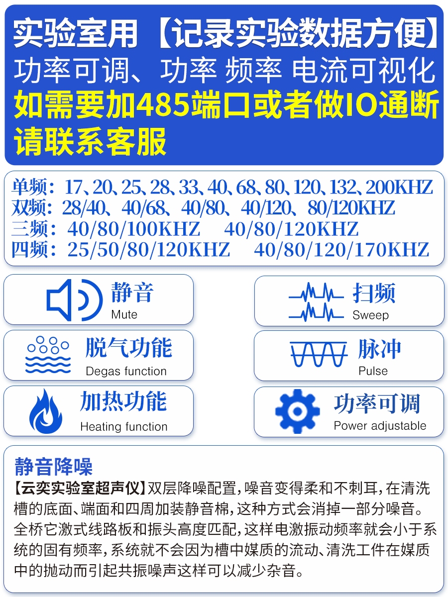 功能:静音、扫频、脉冲、脱气、加热、功率 频率 电流可视化、功率可调