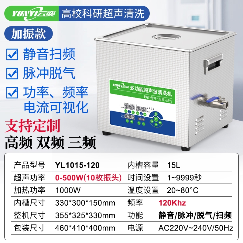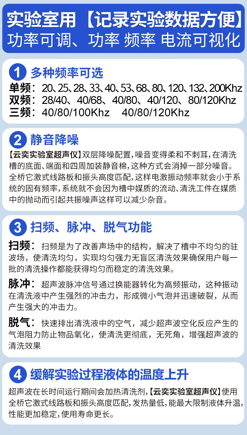 超声波清洗机实验室专用款,超声波振子和全桥它激式线路板高度匹配,针对实验室中对温度敏感的,云奕YL系列实验室超声波超声波清洗机,可减缓温度升高的速度,满足实验的需求。YL系列功率可调,功率、频率、电流、时间、温度可视化,方便记录整个实验过程的数据,还有超声波频率多个频段的选择,可以满足不同实验的使用要求。