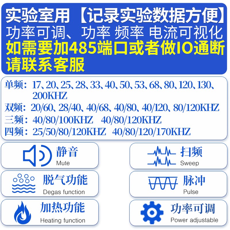 功能:静音、扫频、脉冲、脱气、加热、功率 频率 电流可视化、功率可调