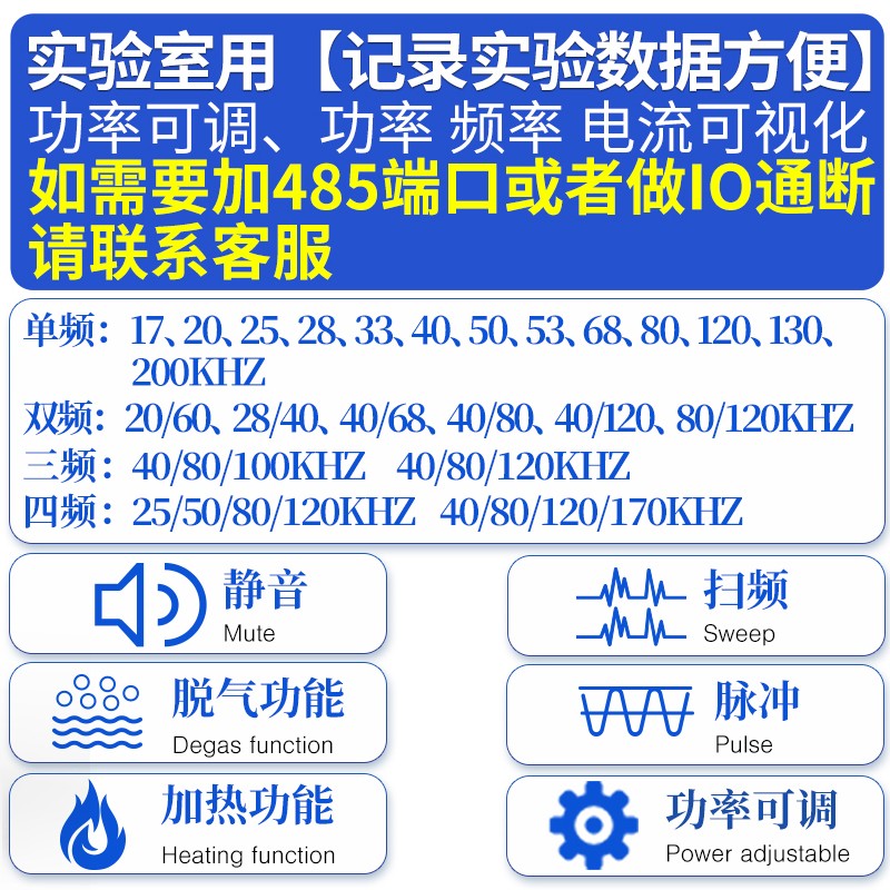 功能:静音、扫频、脉冲、脱气、加热、功率 频率 电流可视化、功率可调
