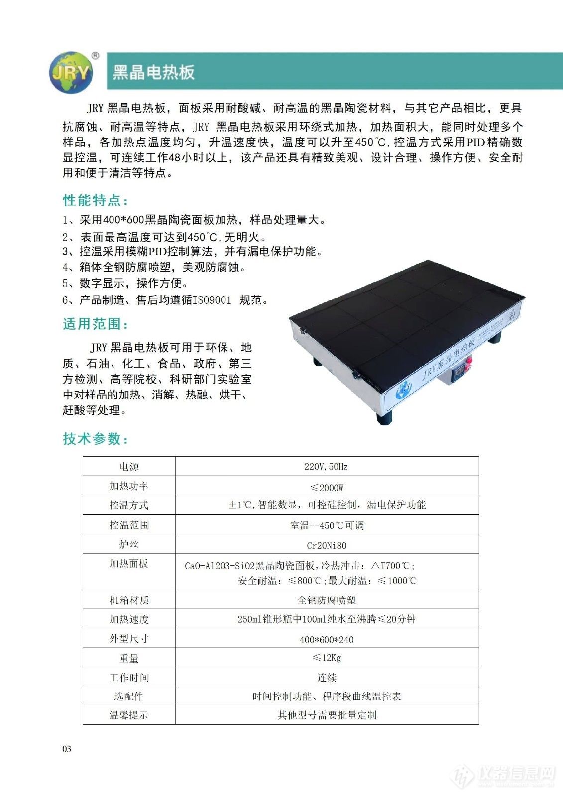 JRY黑晶电热板,面板采用耐酸碱、耐高温的黑晶陶瓷材料,与其它产品相比,更具 抗腐蚀、耐高温等特点,JRY黑晶电热板采用环绕式加热,加热面积大,能同时处理多个 样品,各加热点温度均匀,升温速度快,温度可以升至450C,控温方式采用PID精确数 显控温,可连续工作48小时以上,该产品还具有精致美观、设计合理、操作方便、安全耐 用和便于清洁等特点。