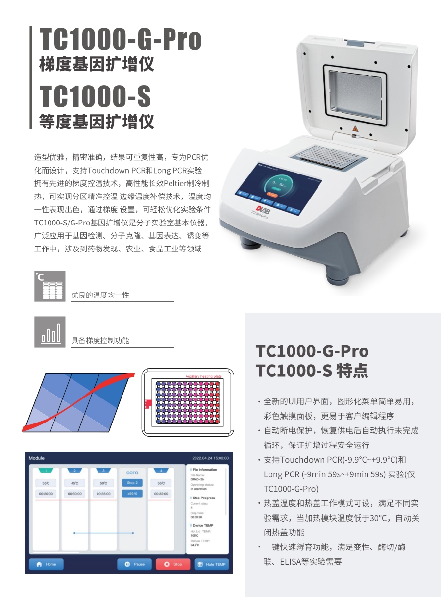 造型优雅,精密准确,结果可重复性高,专为PCR优化而设计,支持Touchdown PCR和LongPCR实验拥有先进的梯度控温技术,高性能长效Peltier制冷制热,可实现分区精准控温 边缘温度补偿技术,温度均一性表现出色,通过梯度 设置,可轻松优化实验条件TC1000-S/G-Pro基因扩增仪是分子实验室基本仪器,广泛应用于基因检测、分子克隆、基因表达、诱变等工作中,涉及到药物发现、农业、食品工业等领域。