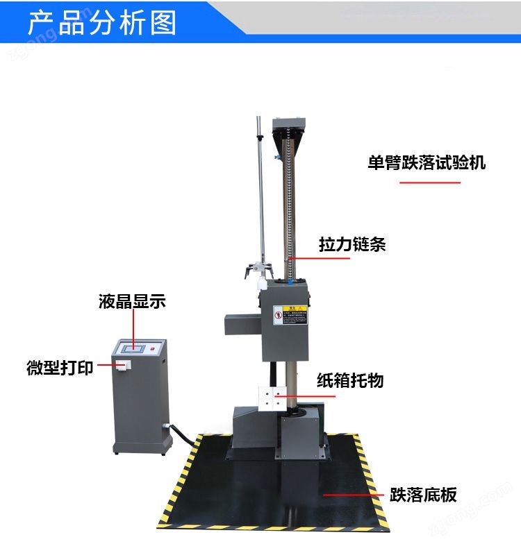 单臂跌落试验机是单臂设计,设备通常采用单臂结构,便于操作和调整;高度可调,跌落高度可以根据测试要求进行调整,通常通过电动或手动方式实现;多种跌落方式,支持角跌落、棱跌落和面跌落等多种跌落方式,以模拟不同的跌落场景;安全保护,设备通常配备安全防护装置,如防护栏和紧急停止按钮,确保操作安全;数据记录,部分高品质设备配备数据记录功能,可以记录跌落高度、冲击力等参数。
