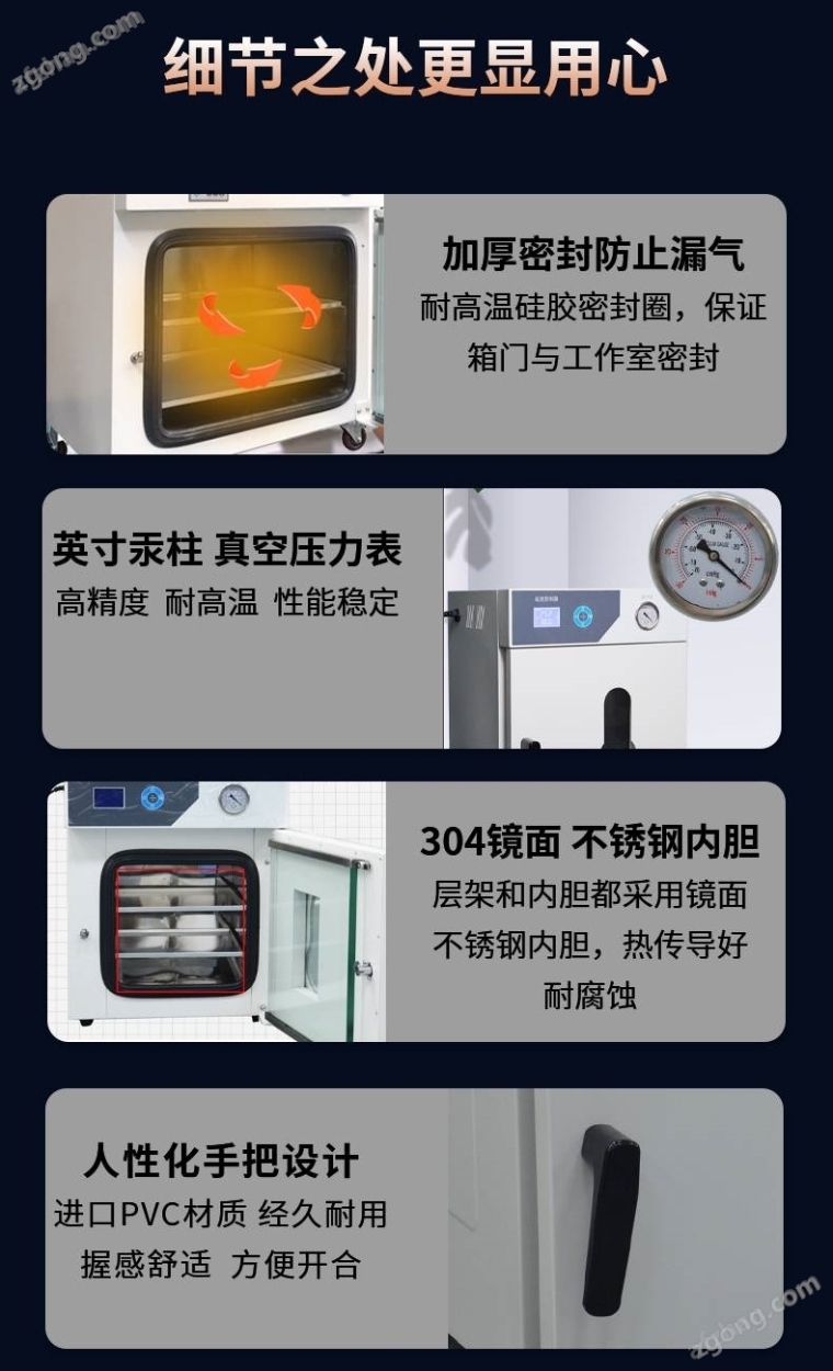 智能真空干燥箱在科研、工业生产和实验室中具有广泛的应用,能够有效提高干燥效率并保护样品质量。选择合适的设备并正确操作,可以显著提升实验或生产的效率和可靠性。真空环境通过真空泵降低箱内气压,减少氧气含量,避免样品氧化或变质;温度控制配备精确的温控系统,可在真空环境下实现均匀加热;干燥效率高在低气压下,水分蒸发速度加快,干燥效率显著提高;多功能性可用于干燥、烘烤、固化、脱气等多种工艺;安全可靠配备真空度监控、过温保护、漏电保护等安全功能,内胆材质采用不锈钢(SUS304),耐腐蚀、易清洁;加热方式是电热管加热或硅胶加热板;容积规格从几十升到几百升不等(可根据需求定制)。