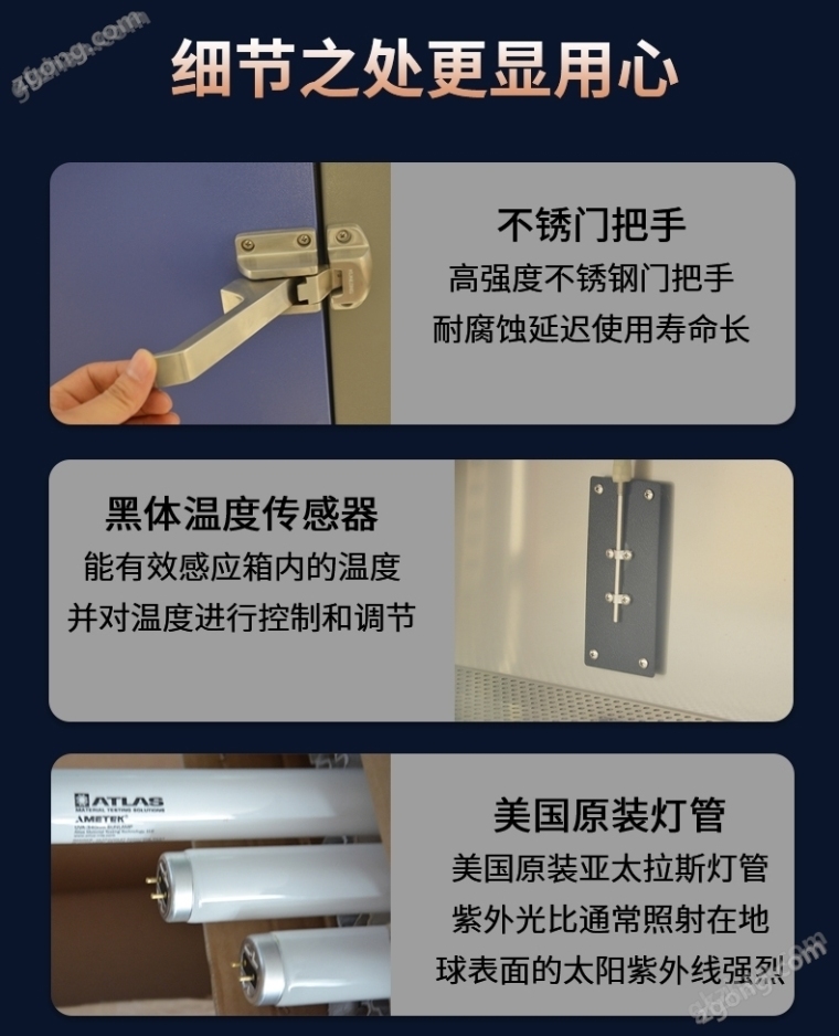 紫外线照射通过UV灯管发射,模拟太阳光中的紫外线辐射;温度调节通过加热元件和制冷系统调节箱内温度,模拟不同环境温度;湿度调节通过加湿器和除湿器调节箱内湿度,模拟不同湿度条件;样品暴露将样品放置在测试箱内,接受紫外线照射和温湿度调节,进行老化测试。
