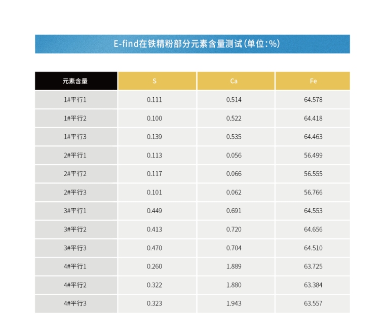 E-find系列仪器可以针对各种类型的矿物通过基本参数法对基体进行校正,且只需简单制样就可以得到高精度的测试结果,与实验室测试结果高度一致;可以针对各种类型的矿物及矿物中多种元素进行高精度分析,可高效快速进行原料或矿样品质评价。