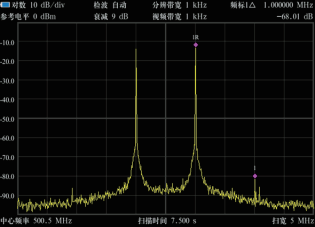 | 三阶交调失真测量 √.同样使用频标的差值方式,测量基波和三阶交调信号。首先将 频标定位到一个基波上,再将频标选择成差值方式,将频标移 到三阶交调信号上,此时显示的△值就是测量结果 |