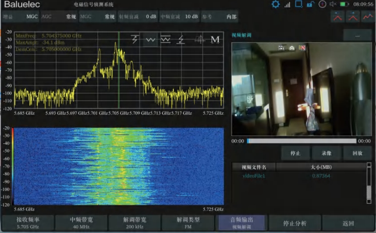 摄像头视频解调 系统可以对常见的1.2G、2.4G和5.8G等针孔摄像头进行 探测和解调,图像输出分辨率480*320,制式包括NTSC、PAL 和SECAM;支持四幅影像的录制和回放。 |