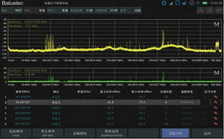 | 窃听窃视信号查找 近场空间的窃听和窃视信号通过与背景电磁频谱差分 获得初步信息,根据信号活动特征、功率大小、出现频次等 多方面进行信号的威胁等级判定,最终筛选出威胁程度最 高的六个信号。 |