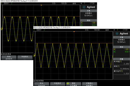 - 图片分别对应正弦波和三角波。波形输出纯净稳定