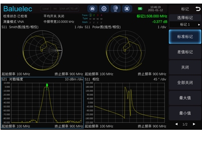 ![]() | 矢量网络分析仪 测量参数:S11、S21 多窗口测量 显示格式:回波损耗、插入损耗、驻波比、相位、群延迟、Smith图 |
