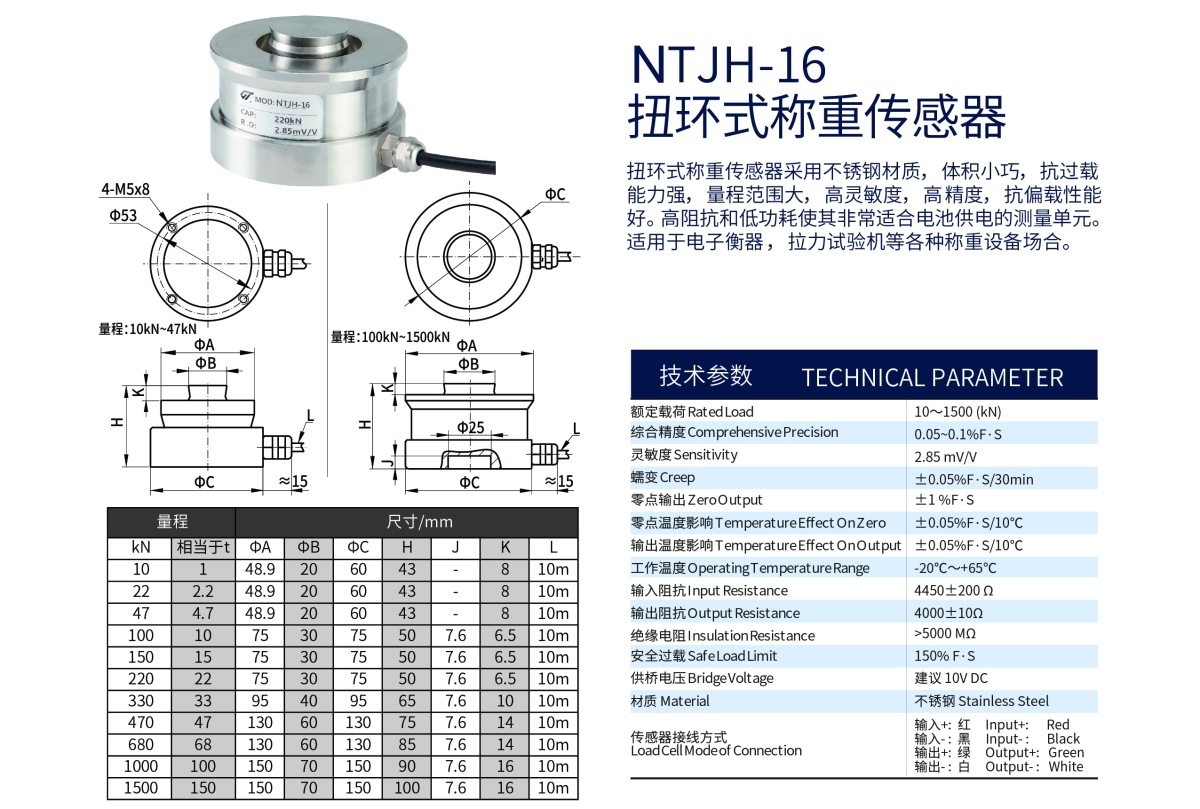 NTJH-16扭环式称重传感器 重量传感器,采用不锈钢材质,体积小巧,抗过载能力强,量程范围大,高灵敏度,高精度,抗偏载性能好。高阻抗和低功耗使其非常适合电池供电的测量单元。适用于电子衡器、拉力试验机、料仓称重等各种称重设备场合。