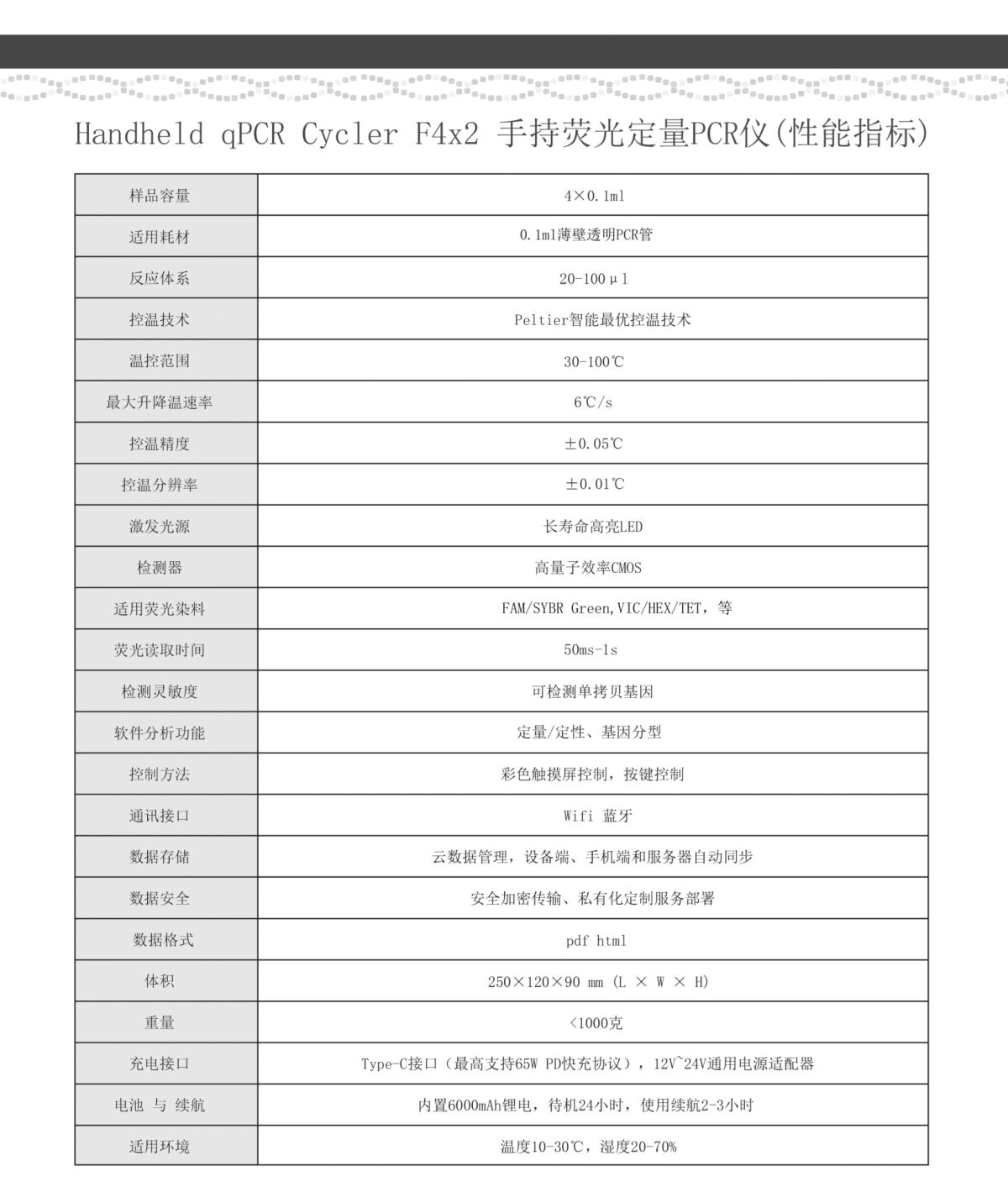 我司的现场快速核酸检测箱,基于的风干试剂体系和手持式qPCR核酸检测平台,实现快速、简便、的分子POCT,颠覆了复杂、繁琐、耗时的传统PCR检测流程。该检测箱可以现场快速进行动物源性成分、转基因和致病微生物的鉴定,为食品安全监管提供技术支撑。