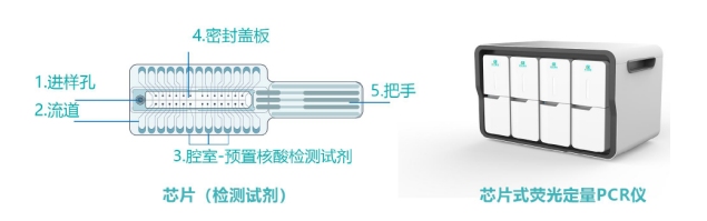 芯片式荧光qPCR多重核酸检测系统是基于微流控技术的qPCR反应装置体系。微流控芯片腔室内预置不同靶标的核酸检测试剂,从进样孔加入待检测样品模板,沿流道注入到各检测腔室复溶检测试剂,盖上盖板密封后,放入芯片式实时荧光PCR仪器内进行qPCR反应。